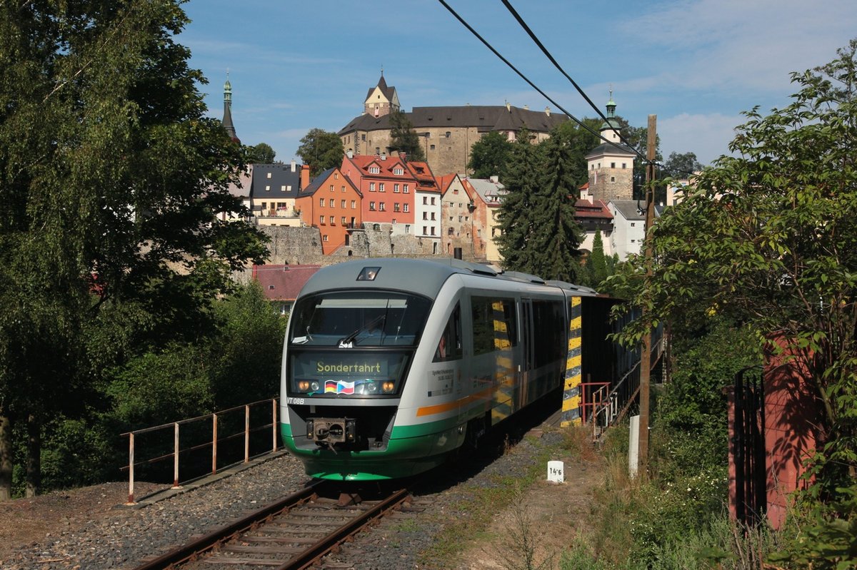 "Egronet-Erkundungstour 16.-18.08.2013" Unser Zug hat Loket předměsti erreicht, das erste Etappenziel dieses Tages. VT08 der VBG als ZOs36090 am 18.08.2013. Rüdiger Ulrich