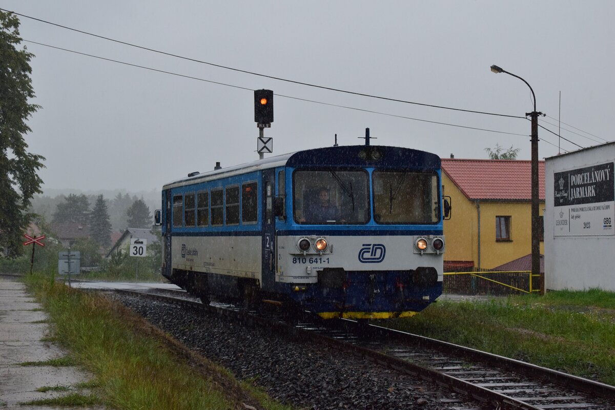 Nachdem ich die gewünschten Züge in Nové Sedlo u Lokte aufgenommen habe ging es rüber ins benachbarte Loucky. Leider schlug das Wetter schnell um und es setzte Regen ein. Aus dem Wetterschutz raus konnte ich 810 641-1 als Os 27124 nach Loket aufnehmen.