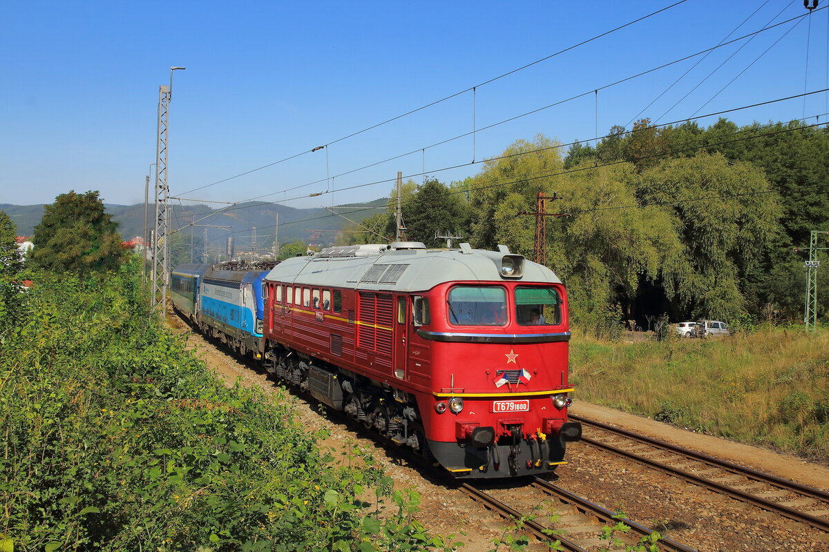 T679 1600 als Vorspannlok für den R609 nach Usti nad Labem, bei der Ausfahrt Klasterec nad Ohri am 24.08.2023. Wegen Oberleitungsabschaltung wurde der Sergej für die Schnellzüge eingesetzt. Andreas Schreiber
