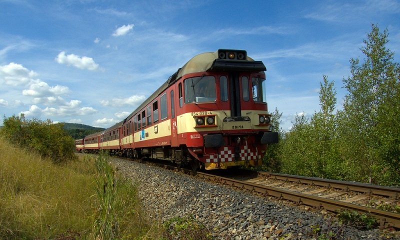 Die 742 097-9 mit leerem Schnelzug 1535 von Praha nach Chomutov. Dieser Zug hatte Verspätung über 150 Minuten. An Sporice fotografiert. (20. 8. 07) Libor Bajer