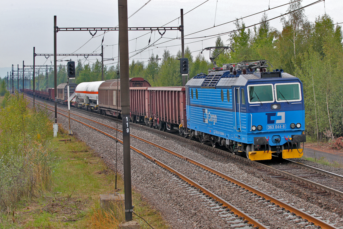 In neuem Farbkleid fährt die 363 004-9 in Kyjice mit einem gemischten Güterzug vorbei.Bild vom 11.9.2015