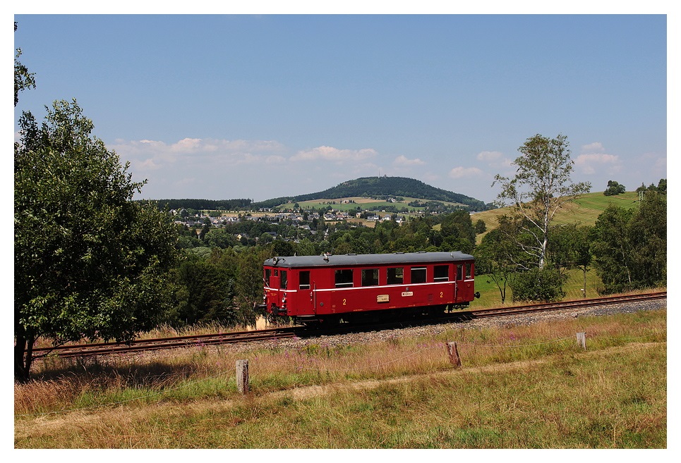 Die Länderbahn in Form des VT 34 steht am 8.6.2024 um 15.59 Uhr abfahrbereit nach Cranzahl im tschechischen Bahnhof Chomutov.