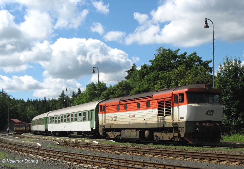 749 224 hat von Ceska Lipa (Böhmisch Leipa) kommend in Jedlova (Tannenberg) die Ankunft des 810 315 als Os 2630/1 aus Decin (Tetschen-Bodenbach) abgewartet und fährt als Sp 1810 weiter nach Rumburk (Rumburg) - 15.07.2006