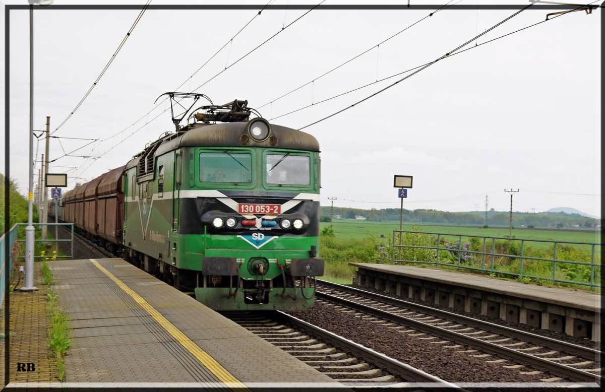 130 053 der SD–Kolejová doprava a.s.(Nordböhmische Grubenschienenverkehrs-AG) auf ihrer Fahrt in Richtung Usti nad Labem. Nove Kopisty 06.05.2015 Rene Brendel