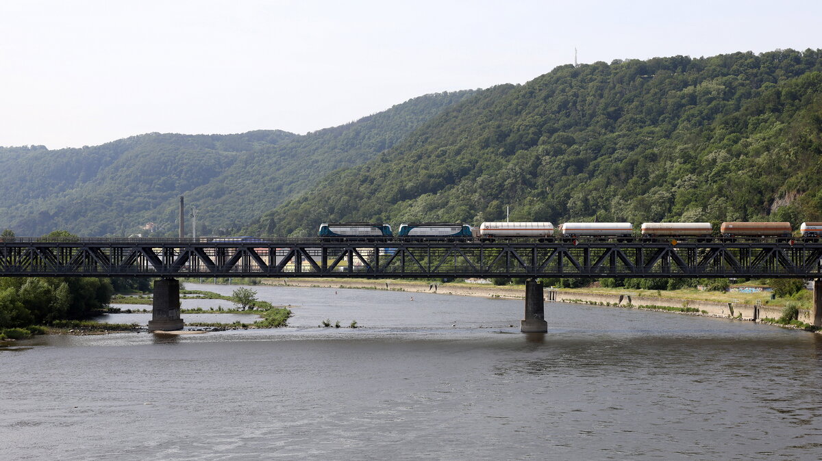 Die Elbbebrücke bei Usti wird hier gerade von einem Kesselwagenzug mit Dppelbespannung passiert. 02.06.2023 10:37 Uhr.
