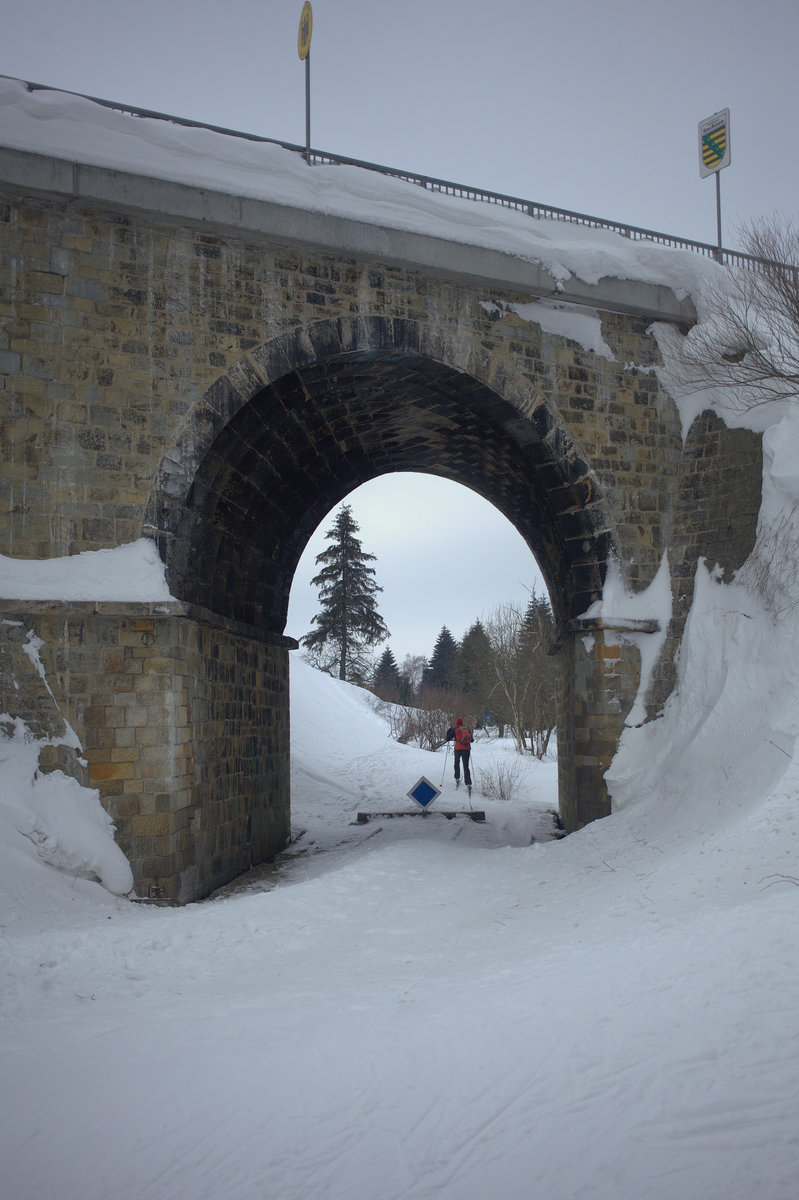 Hinter der Brücke beginnt Sachsen, ehenmalige Strecke Freiberg-Moldava.Heute eine Loipe.20.01.2019 12.28 Uhr, beim Skiwandern aufgenommen.