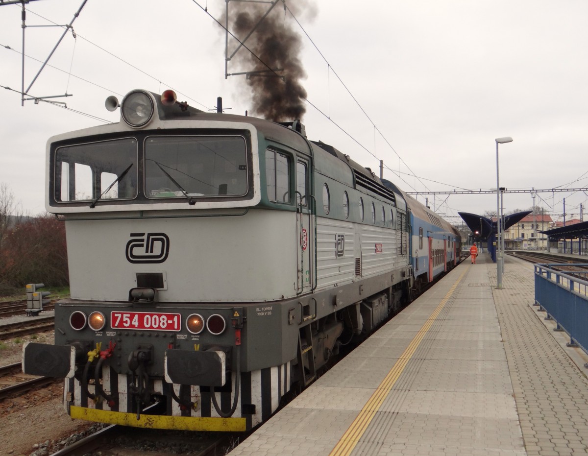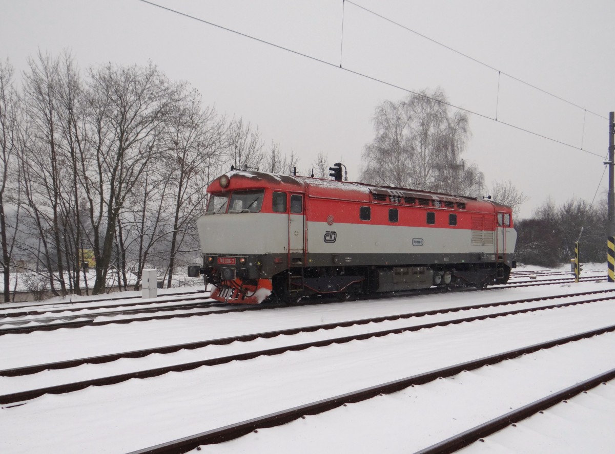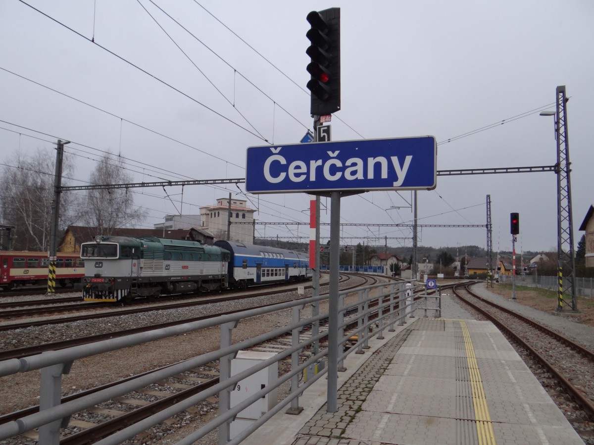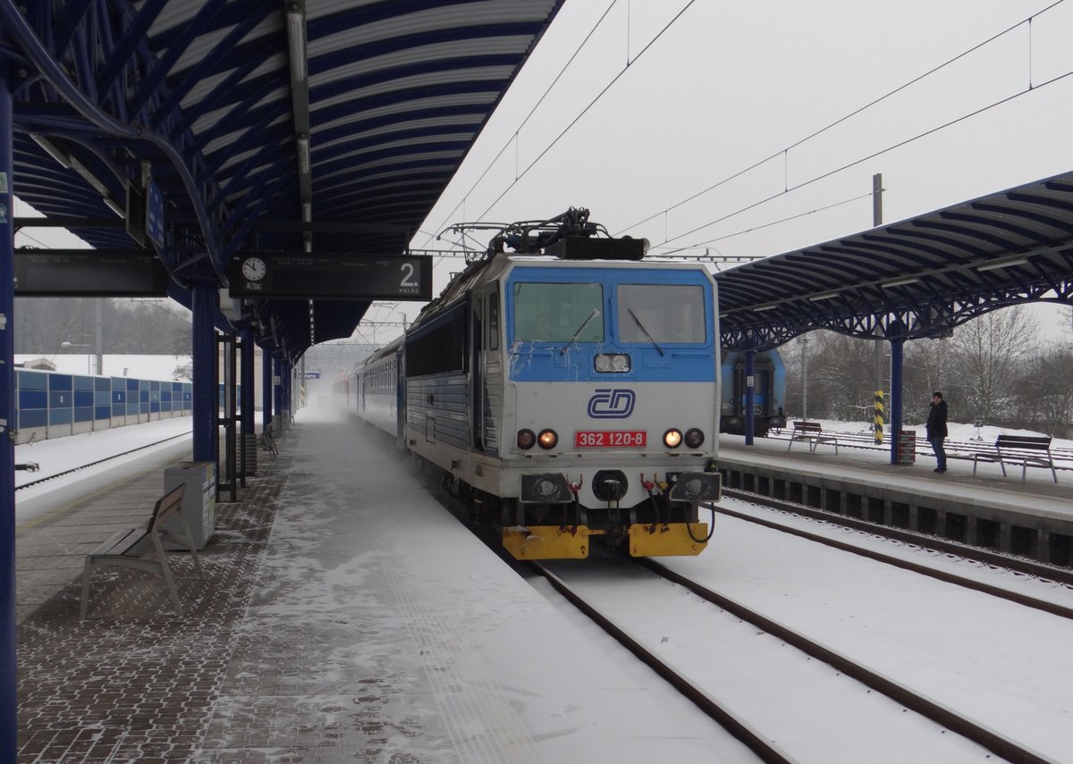 362 120-8 ist am 23.01.16 mit einem Schnellzug in Čerčany zu sehen.