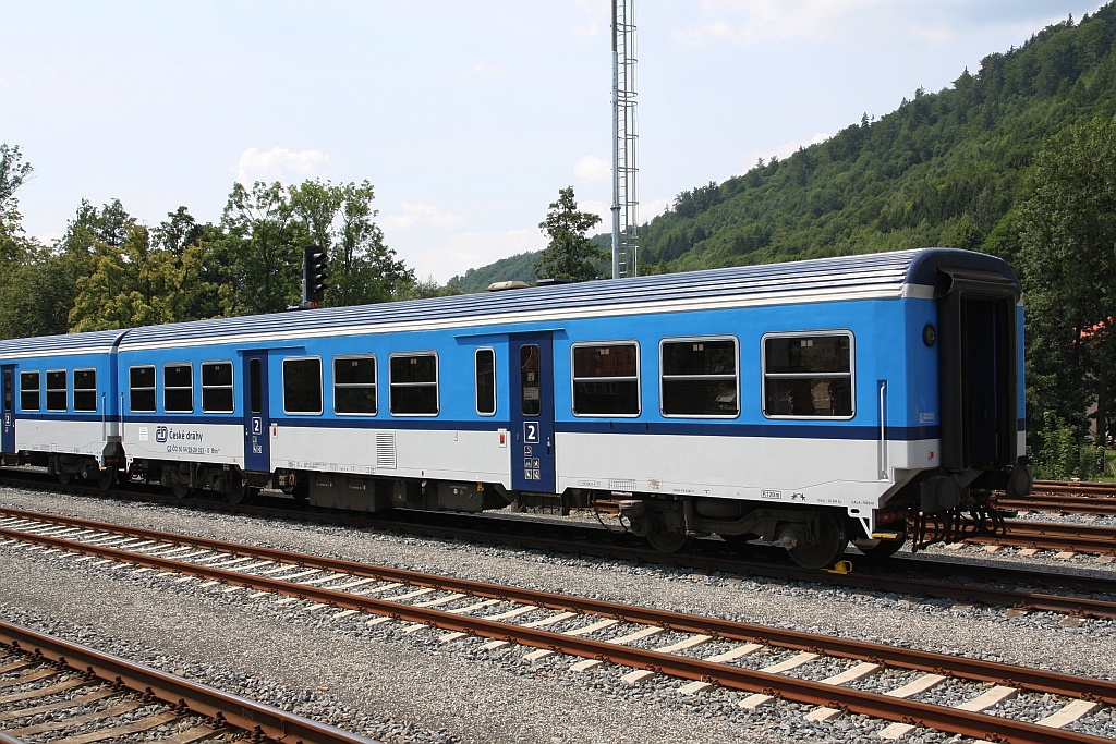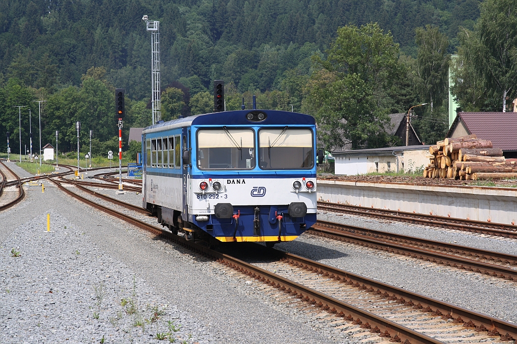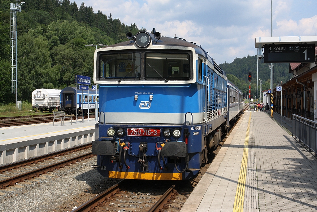 Teleblick auf Hanušovice (deutsch Hannsdorf) , ein modernisierter Umsteigebahnhof an der Strecke Zábřeh-Jeseník . Ganz in der Nähe liegt die Brauerei Holba, hier wird ein