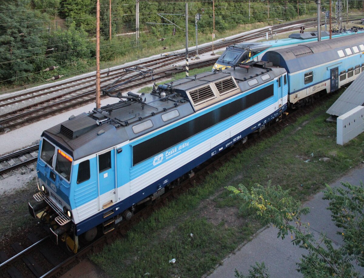 Die Gleichstromvariante der Škoda 69E, Baureihe 162, beim Umspannen für den Prager Schnellzug im Bahnhof Děčín im Oktober 2025.