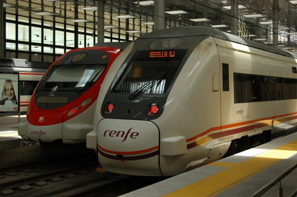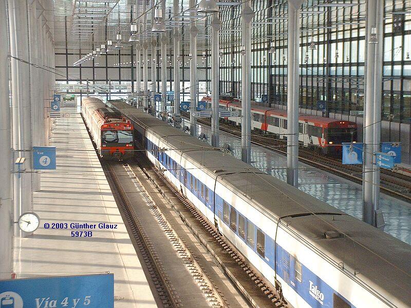 Nahverkehrs-Triebwagen 440 187 und 440 251 am 24.09.2003 im schönen neuen Hauptbahnhof Cadiz an der spanischen Südküste. Diese Baureihe hat traurige Berühmtheit durch die Spengstoffanschläge in Madrid erlangt. Im Vordergrund ein Talgo-Nachtzug, der über Nacht nach Madrid fährt. Günther Glauz