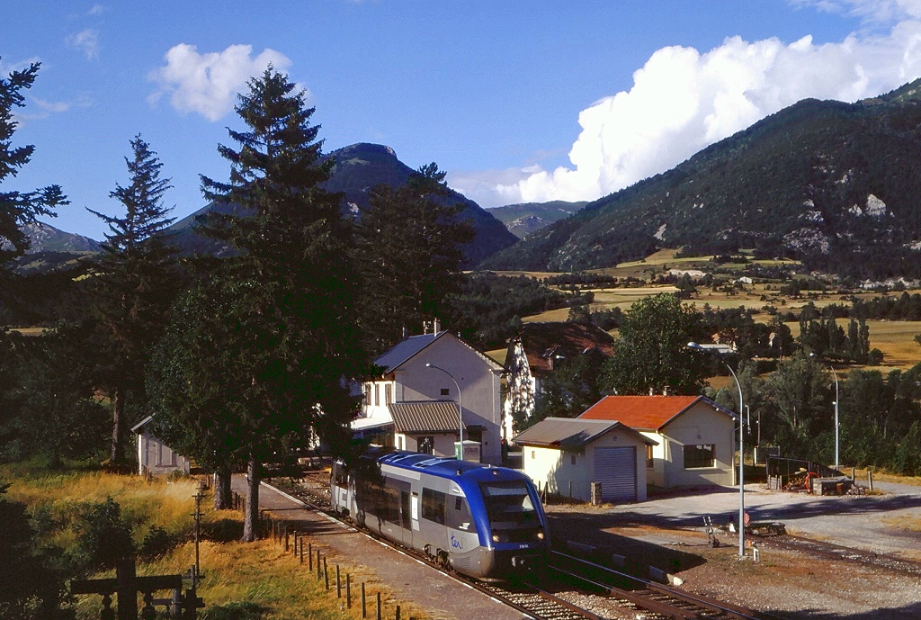 Eine Garnitur aus zwei x2700 überqueren den Viadukt bei Lus La Croix Haute in Richtung Grenoble, 29.08.1991. Persönliche Anmerkung: das Tal südlich von Grenoble bis Serres ist schlicht und einfach das schönste Tal in den Alpen!