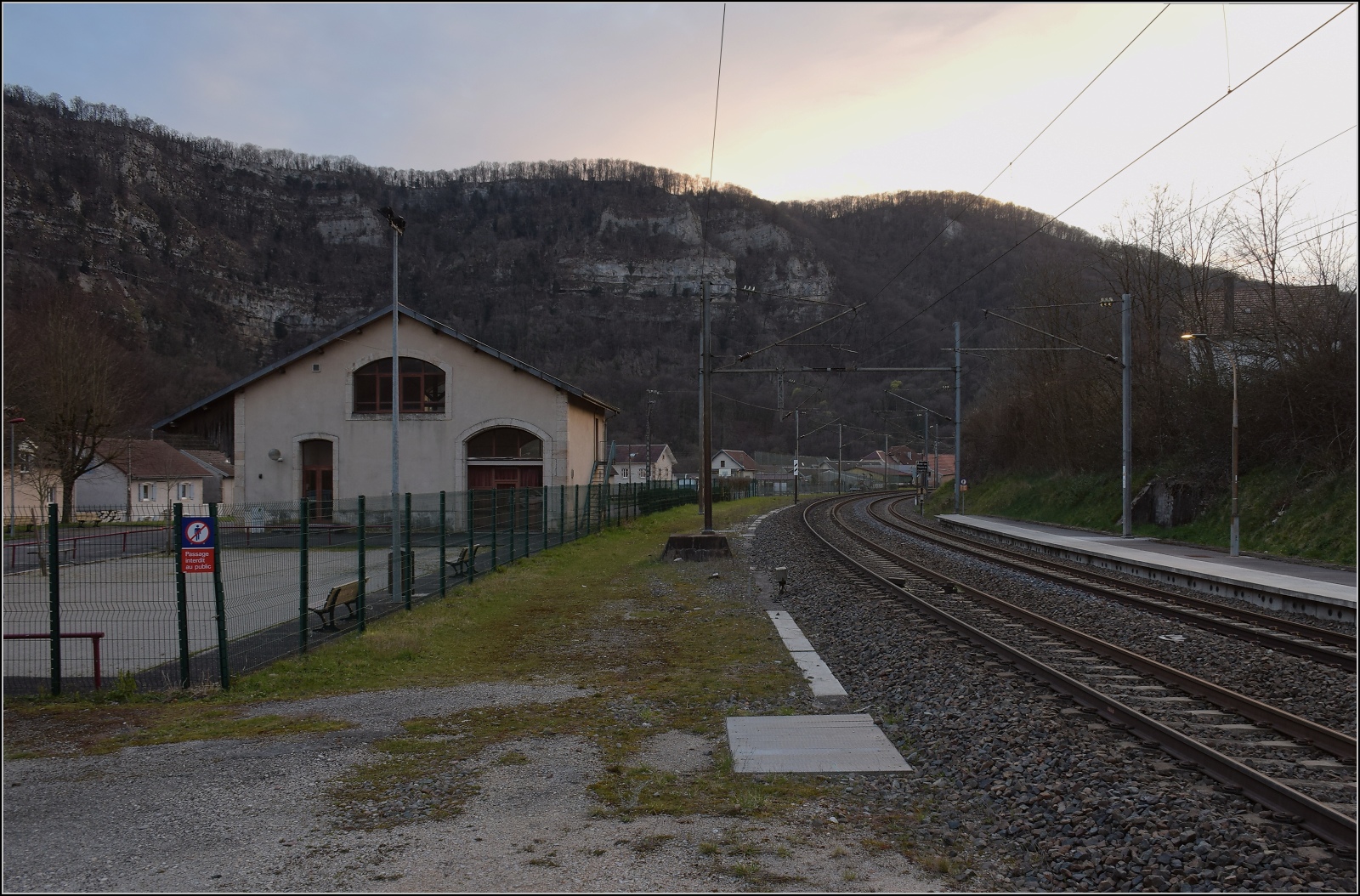 Zwar gibt es kaum brauchbare Fotostellen an der Strecke, aber das Doubstal ist deutlich spektakulärer, als ich mir es vorgestellt hatte. Bis zu 300 m tief eingeschnitten in die letzten Ausläufer des Jura dürfte die Fahrt mit der Bahn sehr interessant sein. Hier mit Blick auf den ehemaligen Güterschuppen von Laissey und die Felsen der Côte de Vaite, ein Jura-Gebirgszug, der den Doubs vom südlichen abflusslosen Plateau trennt. Auch geologisch interessant, zwischen der Loue und dem Audeux entwässern auf etwa 35 Länge alle Gewässer unterirdisch durch diese Bergkette. Bei Champlive wird das Flüsschen Gour eingefangen und im tieferliegenden Laissey zur Energiegewinnung genutzt. Früher gab es gegenüber Laissey einen Wasserfall aus dem Berg, auf dieser Bergseite Rognon genannt. März 2023. Olli