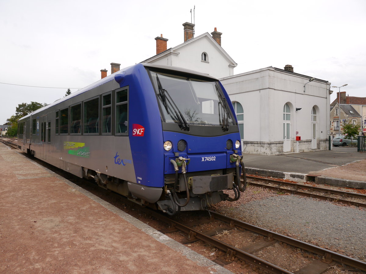 Der Meterspur-Dieseltriebzug SNCF-X74502 steht abfahrbereit als TER61255 von Romorantin nach Valençay im Bahnhof Romorantin. Der Bahnhof Romorantin ist der Betriebsmittelpunkt der Meterspurstrecke der Chemin de fer du Blanc-Argent im Zentrum Frankreichs. Hier beginnen und enden die meisten Züge in beide Richtungen. 2014-09-17 Romorantin Arnulf Sensenbrenner