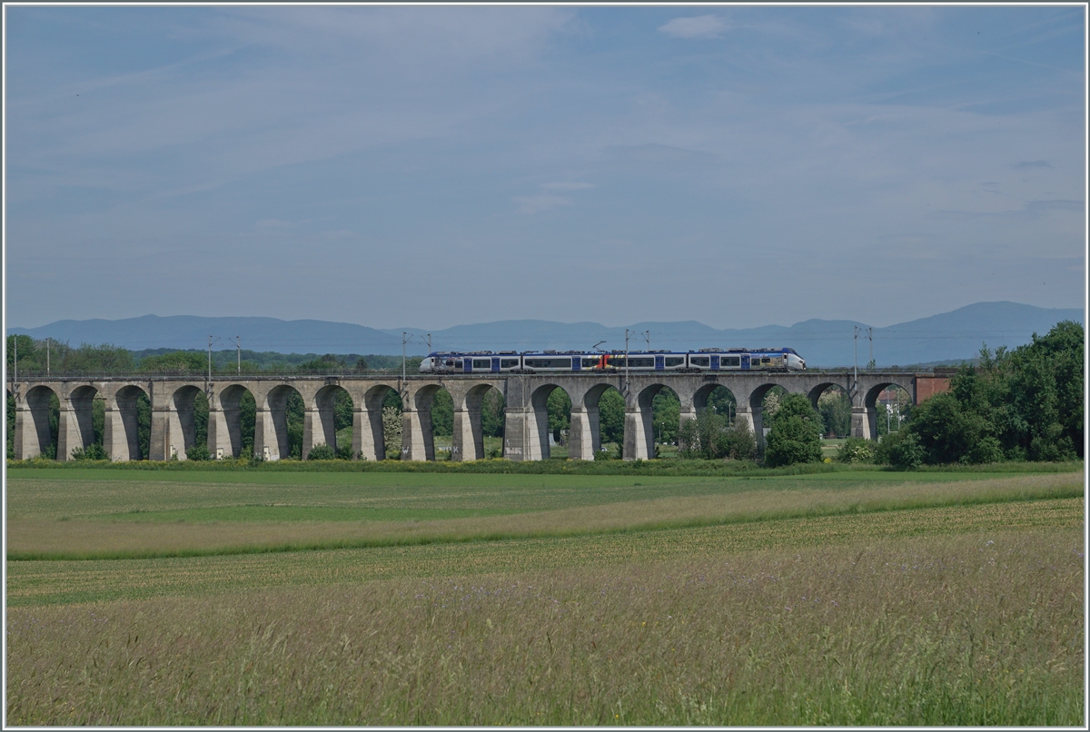 Ein SNCF Coradia Polyvalent der Baureihe B 83500 ist als TER 830412 von Mulhouse nach Belfort unterwegs und fährt kurz nach Dannemarie über den 490 Meter langen Viaduc de Dannemarie, welcher in den Jahren 1860-1862 gebaut wurde.