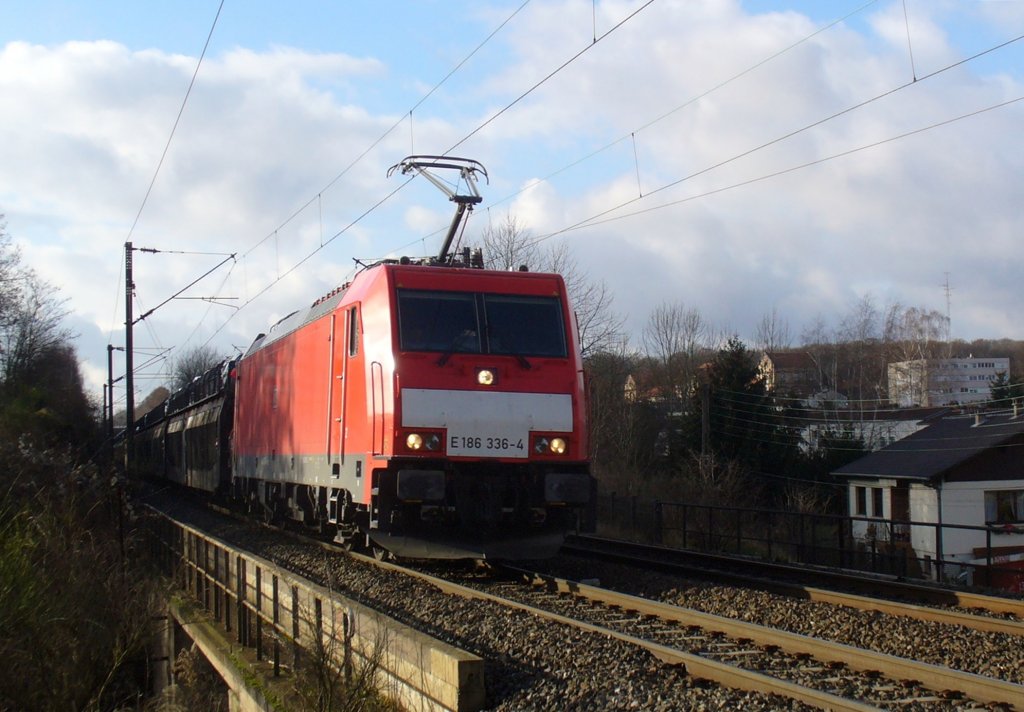 Die blaue 181 201-5 zieht den EN 453 Paris Est - Moskva am 17.12.2011 durch das französische Stiring-Wendel nach Saarbrücken Burbach wo Lokwechsel ist