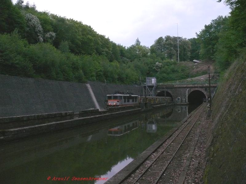 Der Bahntunnel von Arzviller ist mit 2690m der längste Bahntunnel der Vogesenquerung. Er wurde zwischen 1846 und 1850 erbaut. Sein Westportal liegt direkt parallel mit dem des Tunnels des Rhein-Marne-Kanals, welcher zeitgleich errichtet wurde. Rechts des Kanaltunnels liegen noch die Schienen der seit vielen Jahrzehnten eingestellten Treidelbahn, mit der früher die Kanalschiffe gezogen wurden. Dies ist eine recht einmalige Sitation, die sich hier findet.