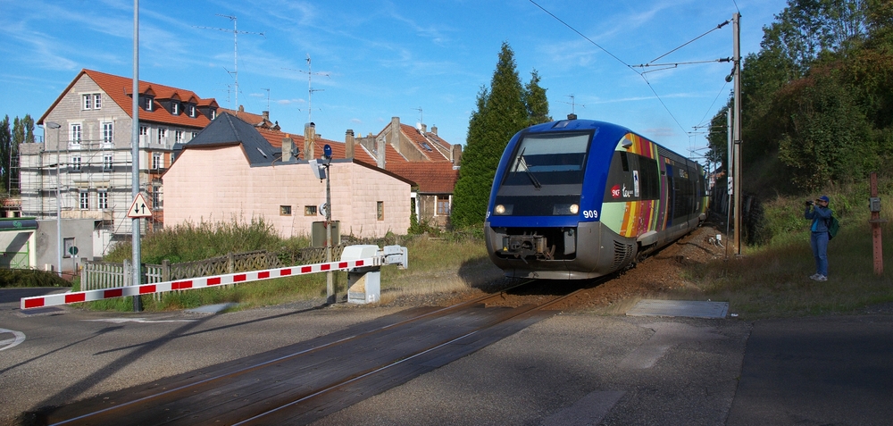 Hier unterqueren die Bombardier Triebwagen die Bahnstrecke Sarrguemines - Bitche, die zur Zeit ohne Eisenbahnverkehr ist.