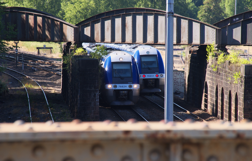 Begegnung an einem Sommerabend - Der Sommer ist zurück und bei strahlend blauem Himmel mußte man einfach raus. Aber erst gegen Abend war ein Ausflug an die Bahnstrecken möglich, tagsüber war es einfach zu heiß. Wohl wissend dass der Bahnbetrieb in Lothringen während der Ferien nicht berauschend ist ging es Richtung Saargemünd. So legten wir uns beim Örtchen Rémelfing kurz vor den Toren Saargemünds auf die Lauer und der Standpunkt bescherte uns diese Begenung. SNCF X 76652 (76651) ist als RE 30906 von Strasbourg nach Sarreguemines unterwegs und 76624 (76623) als RE 30911 nach Strasbourg. Hier unterqueren die Bombardier Triebwagen die Bahnstrecke Sarrguemines - Bitche, die zur Zeit ohne Eisenbahnverkehr ist. Man überlegt ob die Strecke nach einem Erdrutsch noch sanierungswürdig ist. Leider hatte man dort versäumt die Infrastruktur zu pflegen. Die Bürger möchten aber ihren Zug wieder haben, weil das Fahren mit dem Bus zu umständlich ist. 01.08.2013 Bahnstrecke (Ligne) 161000 Mommenheim - Obermodern - Kalhausen - Sarreguemines.