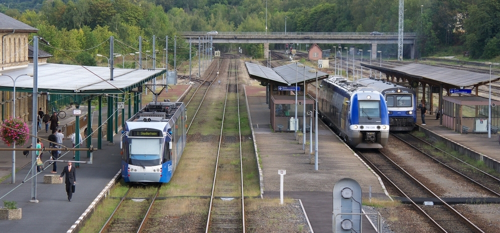Die Saarbahn verbindet...... das Saarland und Lothringen, Deutschland und Frankreich. Aber es fehlt immer noch an einem gemeinsamen Saar-Lor-Lux Verkehrskonzept, auch die "Einfahrsteuer" für Züge aus Deutschland ab dem 2. Bahnhof des SNCF Netzes trägt nicht zur Harmonisierung bei. Optisch passt sich die Saarbahn allerdings gut an die Fahrzeuge des SNCF an. Gegen 18.15 Uhr hat sich der Bahnhof von Saargemünd gefüllt. Der Schnellzug aus Strasbourg wurde schon aufs Abstellgleis rangiert. Zu sehen sind Triebwagen 1019 der Saarbahn, SNCF Ter 76 538, kam aus Bitche und SNCF Ter 4773, kam aus Béning. 15.09.2011