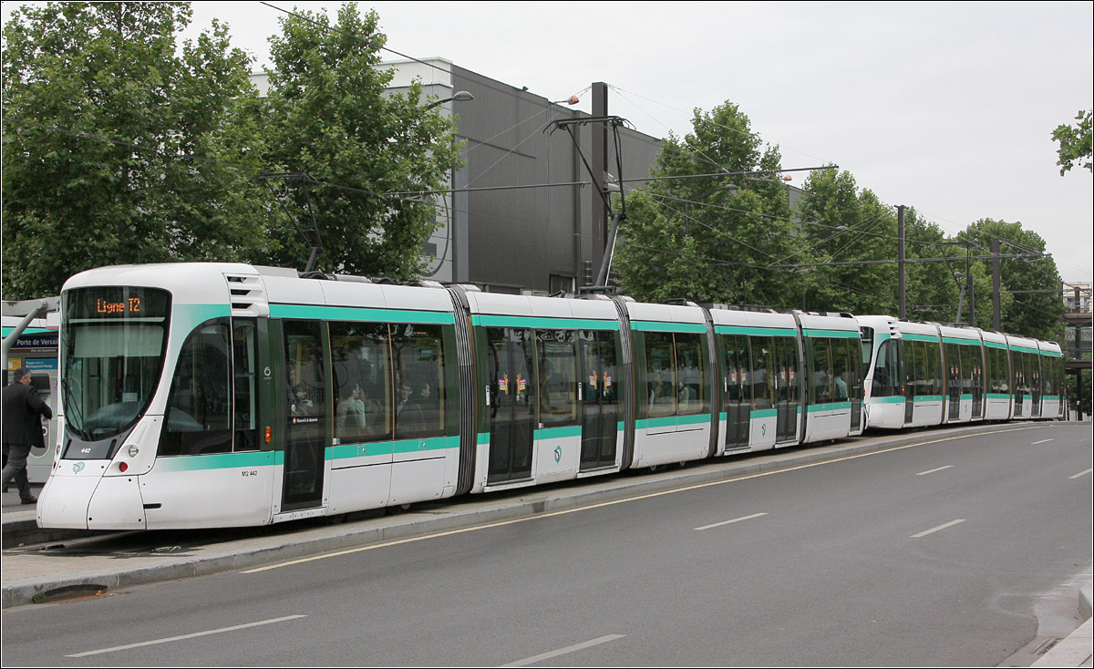 Mit der Verlängerung von "Issy Val de Seine" nach "Porte de Versailles" am 21.11.2009 hat die Linie T2 das eigentliche Paris erreicht. Dort kann in die dritte Straßenbahnlinie (T3) und die Metrolinie 8 umgestiegen werden. Die T2 erhielt mit dieser Verlängerung ihren ersten Abschnitt im Straßenraum. Zwischen den beiden Straßenbahnlinien besteht allerdings keine Gleisverbindung. Auch die Fahrzeuge sind nicht kompatibel, die T3 verwendet 2,65 m breite Fahrzeuge, während die Fahrzeuge der Linie T2 nur 2,40 m breit sind. Geichwohl handelt es sich auf beiden Linien um Citadis-Fahrzeuge. Hier ein langer Zug auf der T2 kurz vor erreichen der Endhaltestelle "Porte de Versailles".