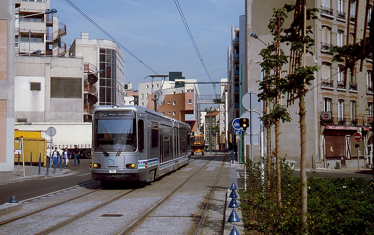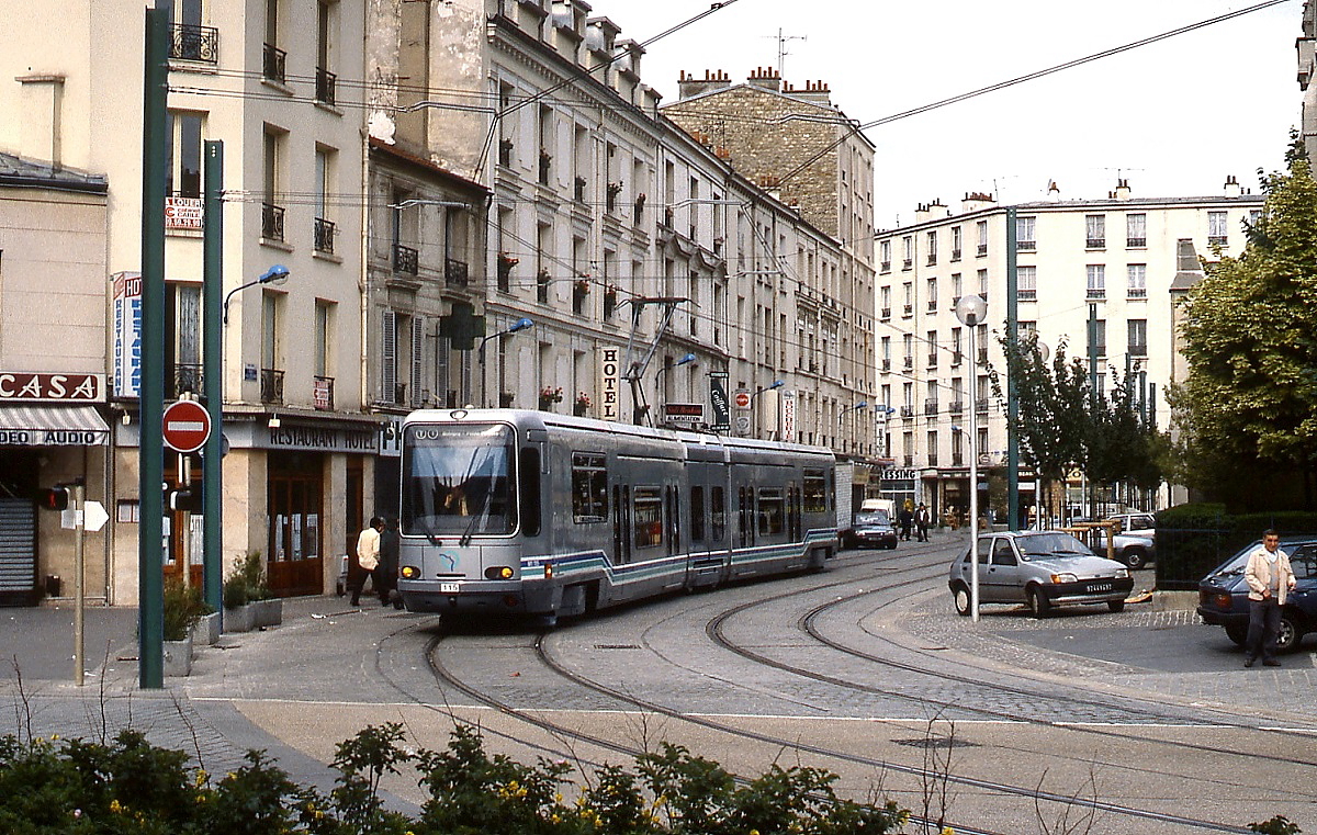 Die 1992 in Betrieb gegangene Linie 1 der Straßenbahn der Ile de France von Gare de Saint-Denis nach Bobigny Pablo Picasso war die erste Straßenbahn, die mehr als ein halbes Jahrhundert nach der Stilllegung der letzten Linien wieder im Großraum Paris verkehrte. Sie verband zunächst als Tangentiallinie zwei Metrostationen. Inzwischen wurde sie in beiden Richtungen verlängert. Im Sommer 1993 fährt der von Alstom gebaute Tw 115 durch die Innenstadt von Saint-Denis.