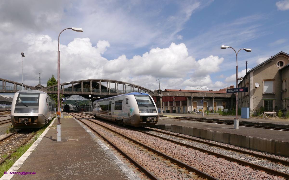 Links SNCF-X73568 und rechts SNCF-X73773 bei der Ausfahrt als TER865807 nach Agen.