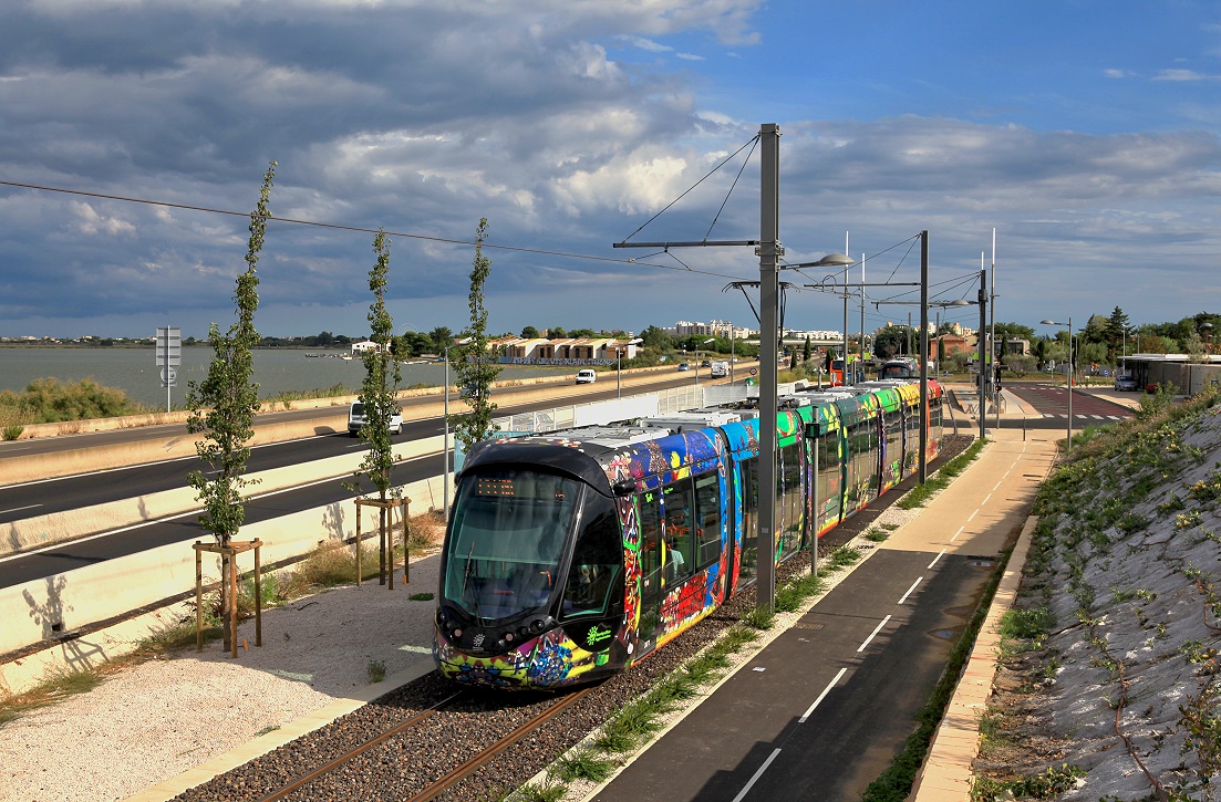 Frankreich, Languedoc, Montpellier Agglomération, Linie 3 Juvignac-Montpellier-Pérols/Lattes (Eröffnung am 6.4.2012), an der Endstation Pérols - Étang de l'Or. Im Hintergraund die Schnellstraße Montpellier - La Grande Motte und der Étang de l'Or. Bis zum Meer geht es zu Fuß oder per Bus einige Kilometer weiter. 25.03.2013 Jean-Claude Delagardelle