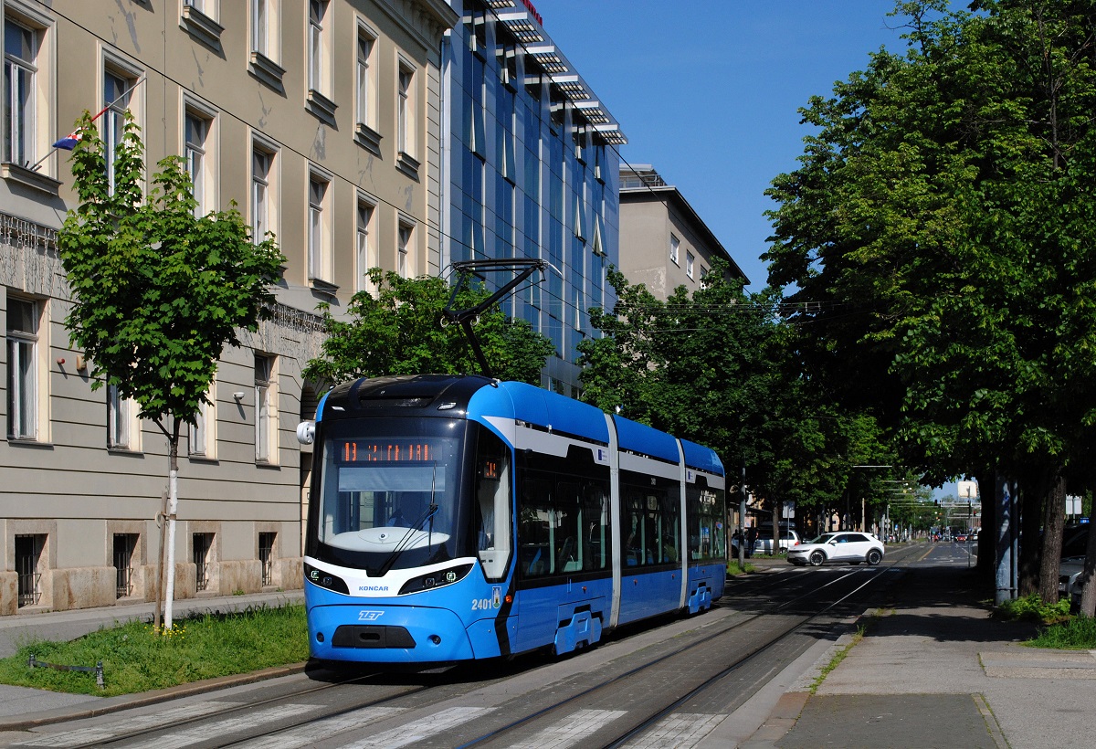 Der fabriksneue Tw.2401 der Type "Crotram 2400" erreicht als Linie 13 aus der ul. Kneza Branimira kommend die Haltestelle Glavni Kolodvor. (27.04.2025) Erwin Schidlofski