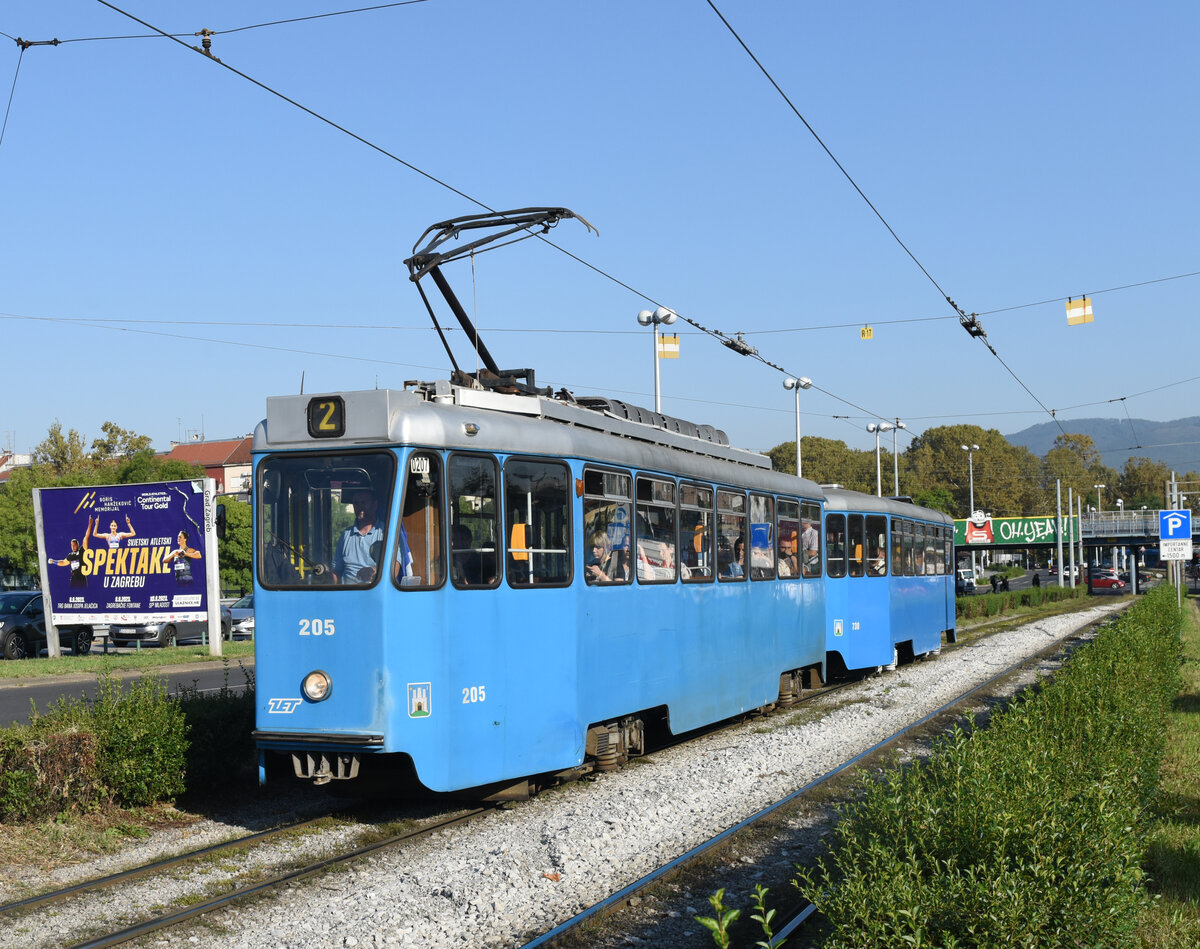 Dieses Bild zeigt den Triebwagen 205 mit dem Beiwagen 730 am 8. September 2023 auf der Linie 2 Kurs 207 auf dem Weg von Črnomerec nach Savišće unweit der Station Autobusni kolodvor. Kriwetz Lukas
