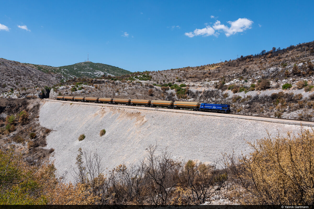 Ein aufwärts fahrender Güterzug von Solin (HR) war laut der Fahrdienstleiterin von Kaštel Stari ab etwa 14 Uhr eingelegt. Lange gewartet werden musste nicht, als die aus Schwenkdachwagen und zwei 2063ern (EMD GT26CW-2) gebildete Fuhre an der geplanten Stelle bei Labin Dalmatinski (HR) vorbeidröhnte.