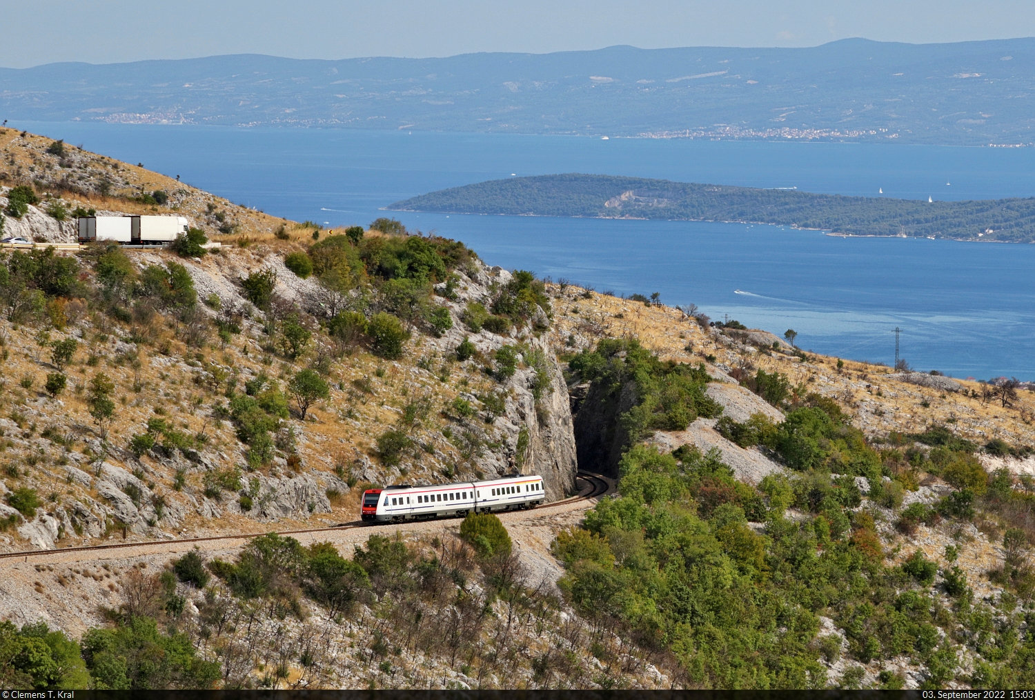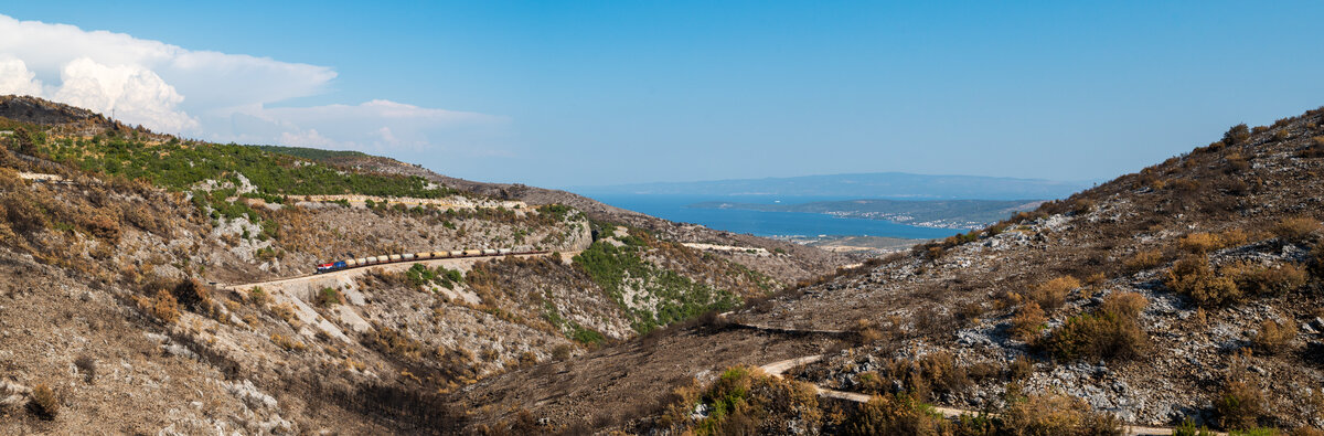 Von der Adria-Küste schlängelt sich ein 7123 (Bombardier RegioSwinger) durch die Berge bei Labin Dalmatinski (HR) ins Landesinnere.