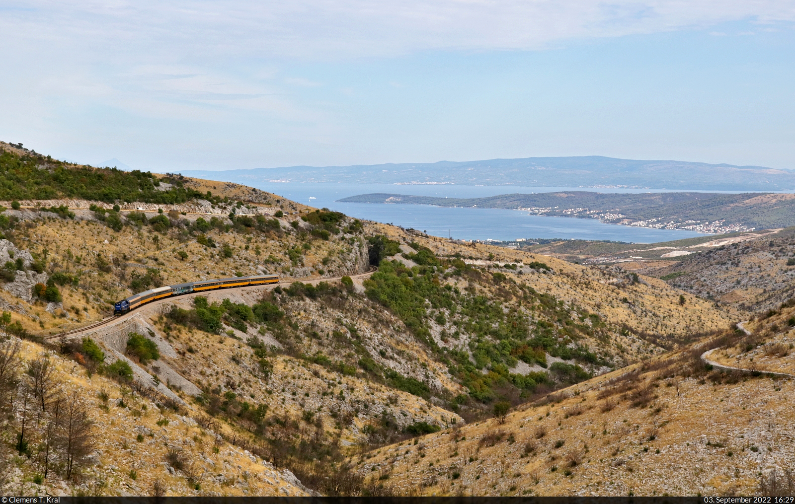Wer sich im EuroNight ab Split (HR) die Adria-Luft und den Dieselgeruch der ordentlich arbeitenden Lok um die Nase wehen lassen will, geht in den Liegewagen, denn dieser ist der einzige Wagen mit Übersetzfenstern. Auf einem der zahlreichen aufgeschütteten Dämme, irgendwo zwischen Sadine und Labin Dalmatinski, ging ein letzter Blick Richtung Meer, ehe sich der Nachtzug weiter ins Gebirge vorarbeitet.