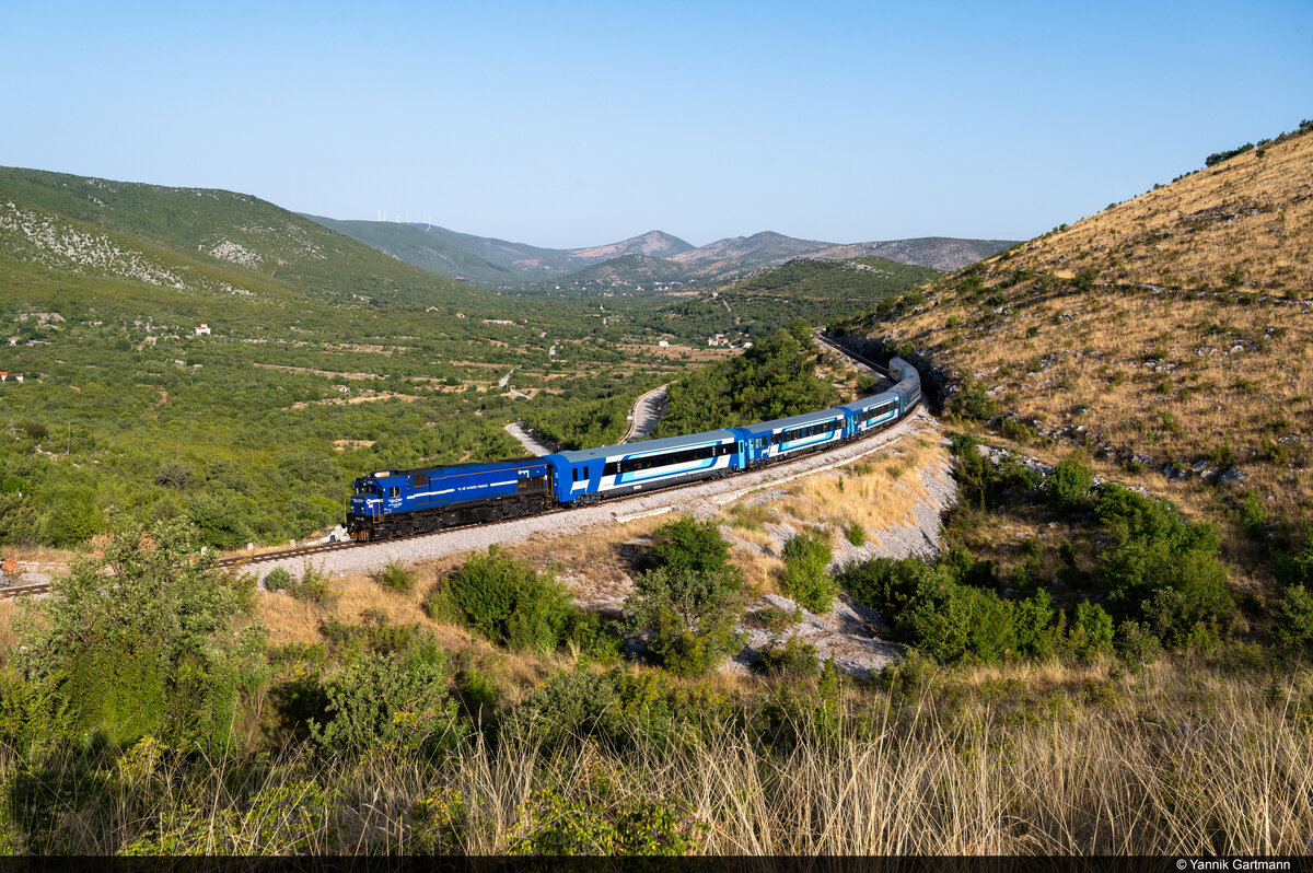 Am Morgen des 11.08.2021 ist HŽPP 2044 028 unterwegs mit dem ungarischen Nachtzug IC 1204 von Budapest-Keleti nach Split und konnte hier in der schönen Fotokurve bei Prgomet aufgenommen werden. Yannik Gartmann