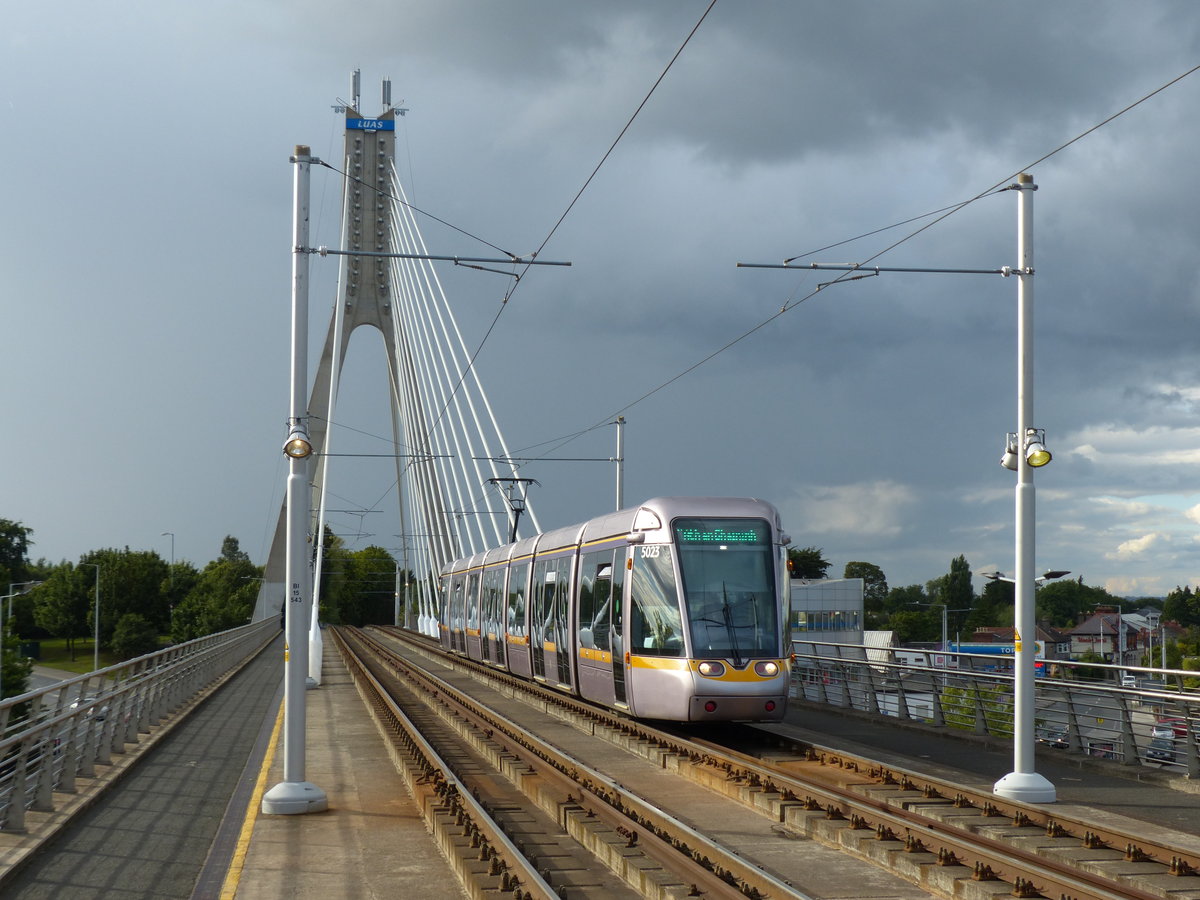 In Dundrum wird eine riesige Straßenkreuzung überquert. Die William Dargan Bridge wurde eigens für die LUAS-Straßenbahn im Jahre 2004 errichtet. Sie ist nach dem irischen Ingenieur William Dargan benannt, der im 19. Jahrhundert am Bau der meisten Bahnstrecken in Irland als Konstrukteur beteiligt war. 5.8.2017, Dundrum