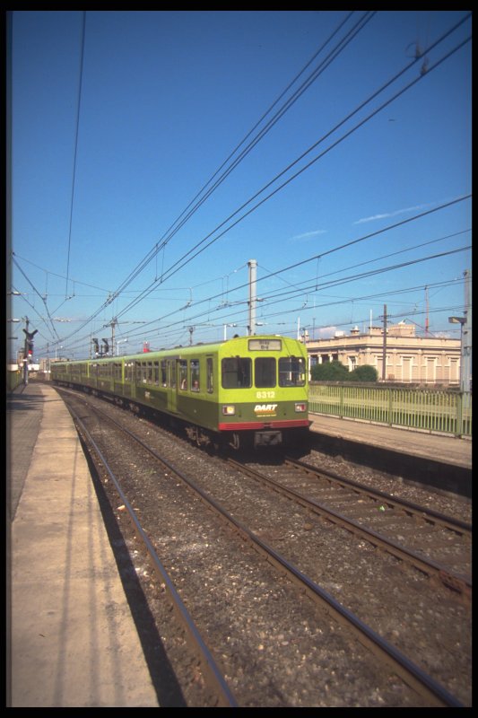 Wagen 8312 im August 1988 am Bahnhof von Dun Laoghaire, dem Hafenbahnhof von Dublin. Hier auf dem Weg nach Bray. Der zweite Ortsname auf dem Zugzielanzeiger ist Gälisch Karsten Schmidt