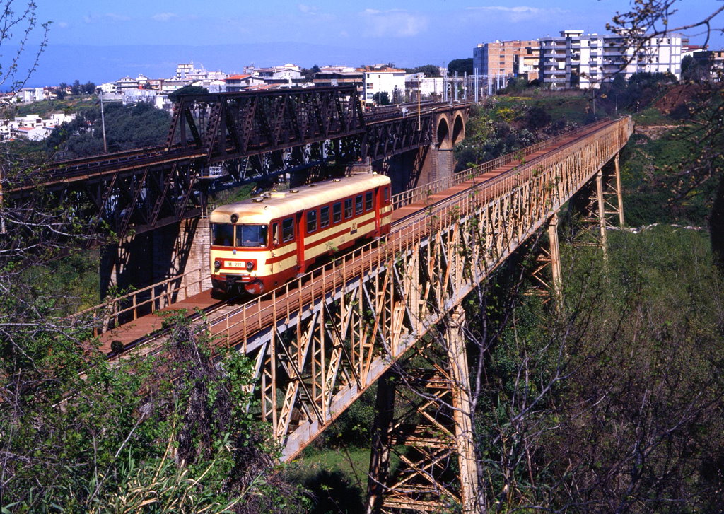 Die Strecke der FC (Ferrovie della Calabria) nach Sinopoli hat am Ausgangsort Gioia Tauro eine eindrucksvolle Brückenkonstruktion. Die Brücke der Staatsbahn steht nur wenige Meter entfernt. Tw 221 am 21.03.2002. Christian Wenger