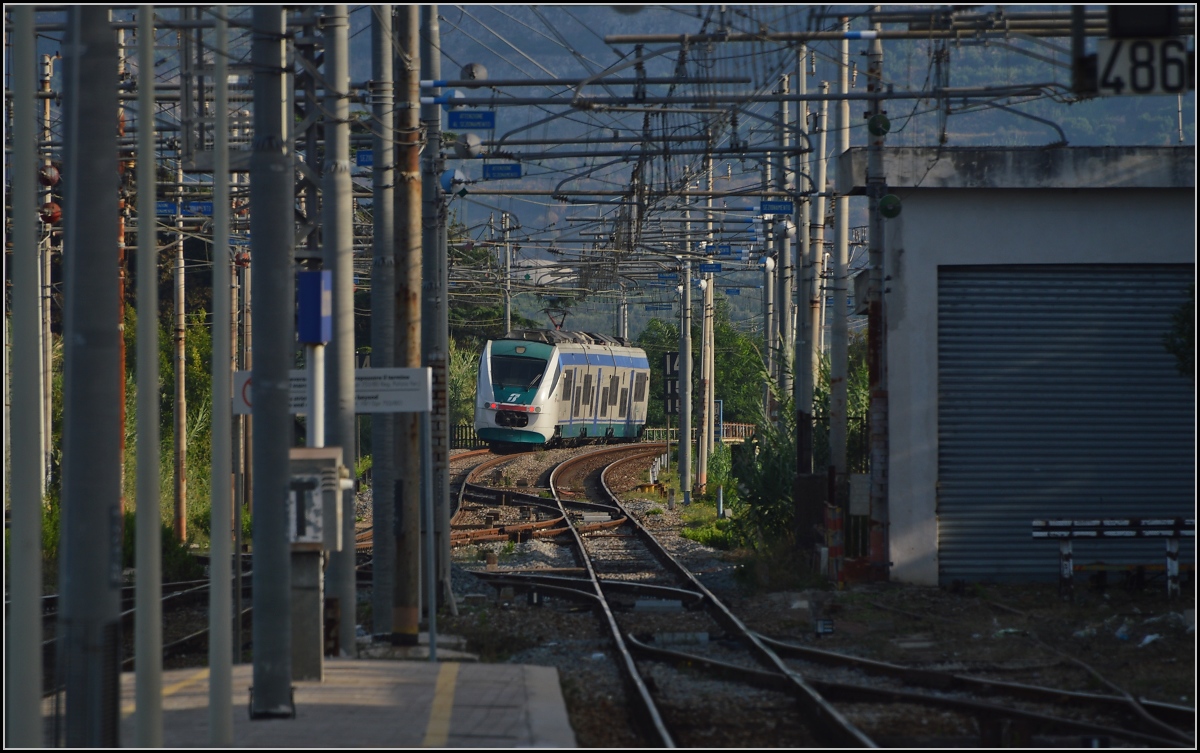 Ein ALe 501 des Regionalverkehrs nimmt in Rosarno die Abkürzung über die Neubaustrecke von Rosarno nach Lamezia Therme. Im August 2013. Olli
