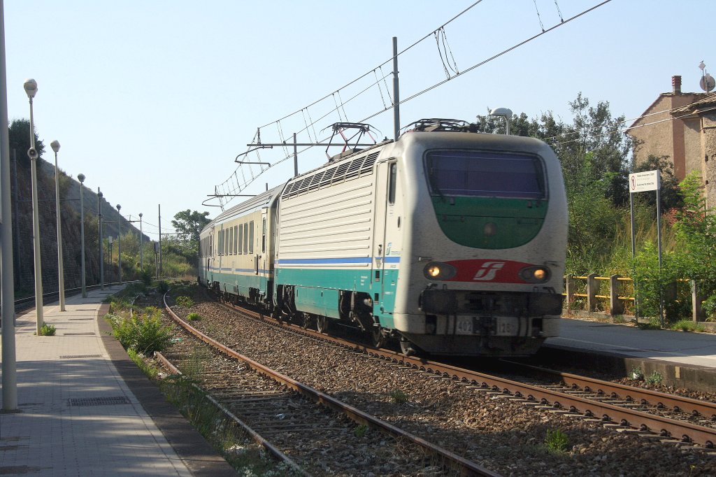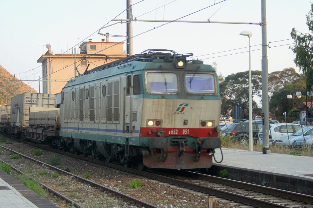 E652 051 kommt mit einem gemischten Güterzug aus Reggio Calabria(I) in Richtung Napoli(I) fährt durch Ascea(I) bei Abendsonne.
