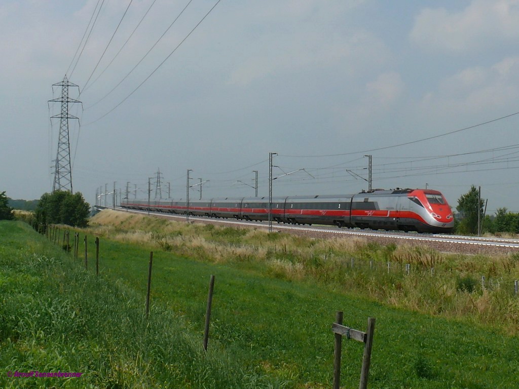 In Fidenza-Bastelli an der Hochgeschwindigkeitsstrecke zwischen Mailand und Bologna rauscht ein ETR500 der FS als Zug Eurostar(ES9533) vorbei. Er fährt von Malpensa-Aeroporto über Milano-Bologna-Firenze-Roma nach Napoli.