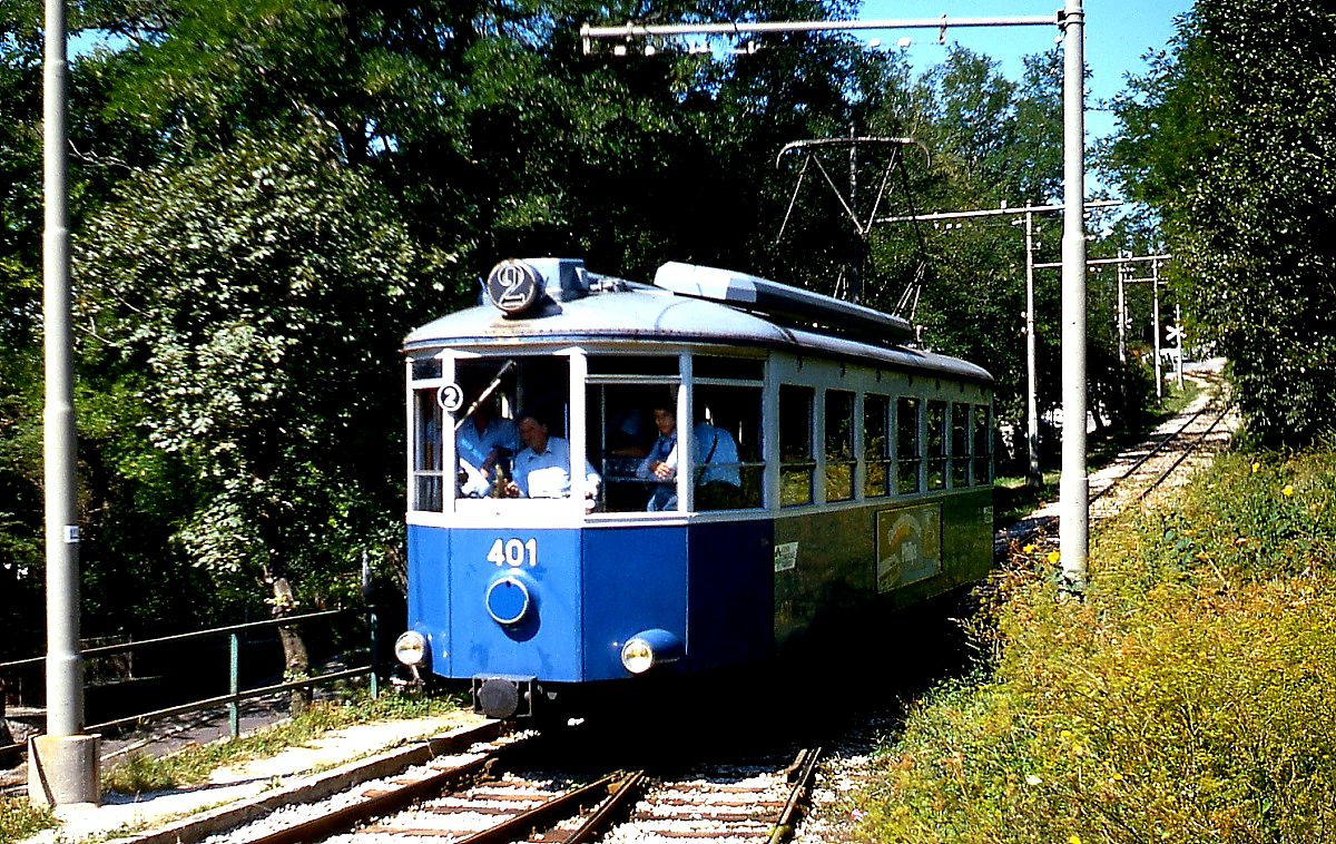 Von Opicina kommend erreicht Tw 401 der Trenovia di Opicina die Bergstation Vetta Scorcola der Standseilbahn (Sommer 1981)