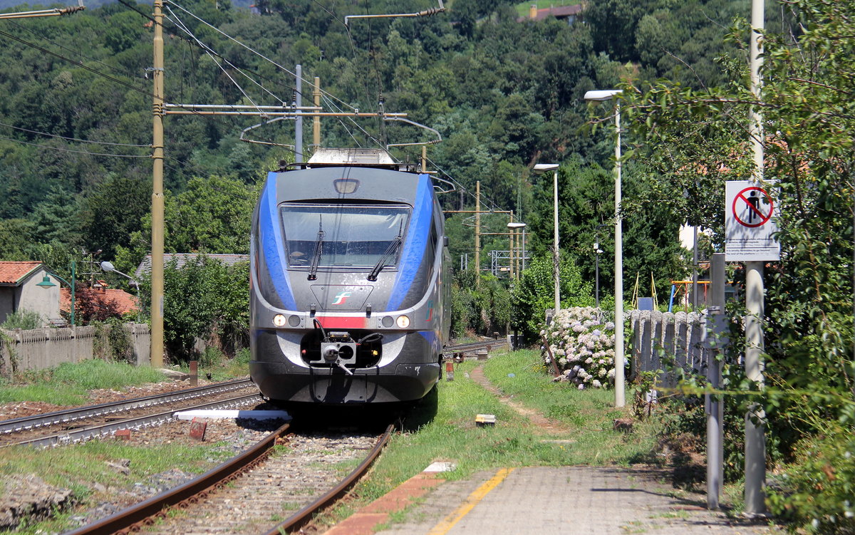 Ein italienischer Regionalzug aus Novara(I) nach Domodossola(I) und fährt in Orta-Miasino(I) ein und hält in Orta-Miasino(I) und fährt in Richtung Domodossola(I).
