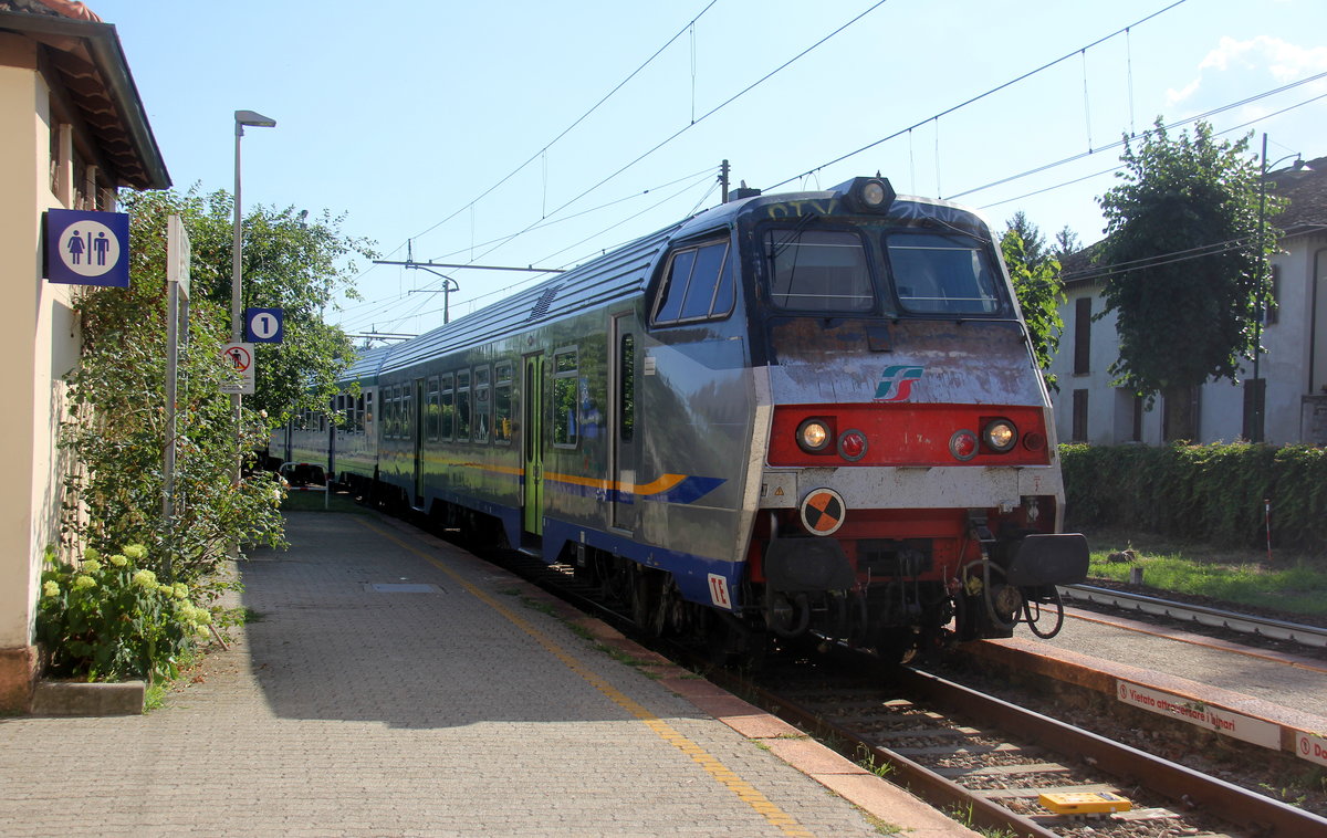 Ein italienischer Regionalzug aus Domodossola(I) nach Novara(I) und kommt aus Richtung Domodossola(I) und fährt Orta-Miasino(I) ein und hält in Orta-Miasino(I) und fährt in Richtung Novara(I).