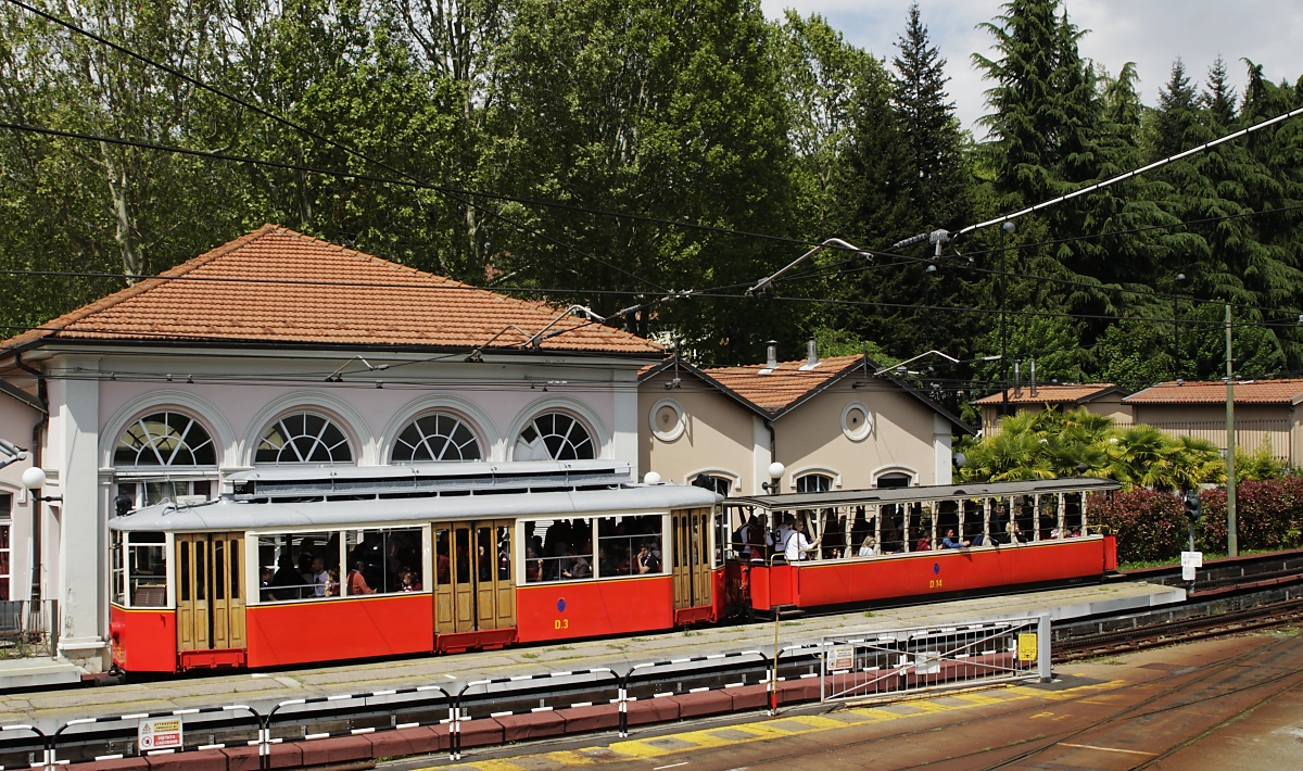 Ein gut besetzter Zug der Zahnradbahn Sassi - Superga bestehend aus dem Triebwagen D.3 und dem Beiwagen 14 verläßt am 04.05.2019 die Talstation Horst Lüdicke