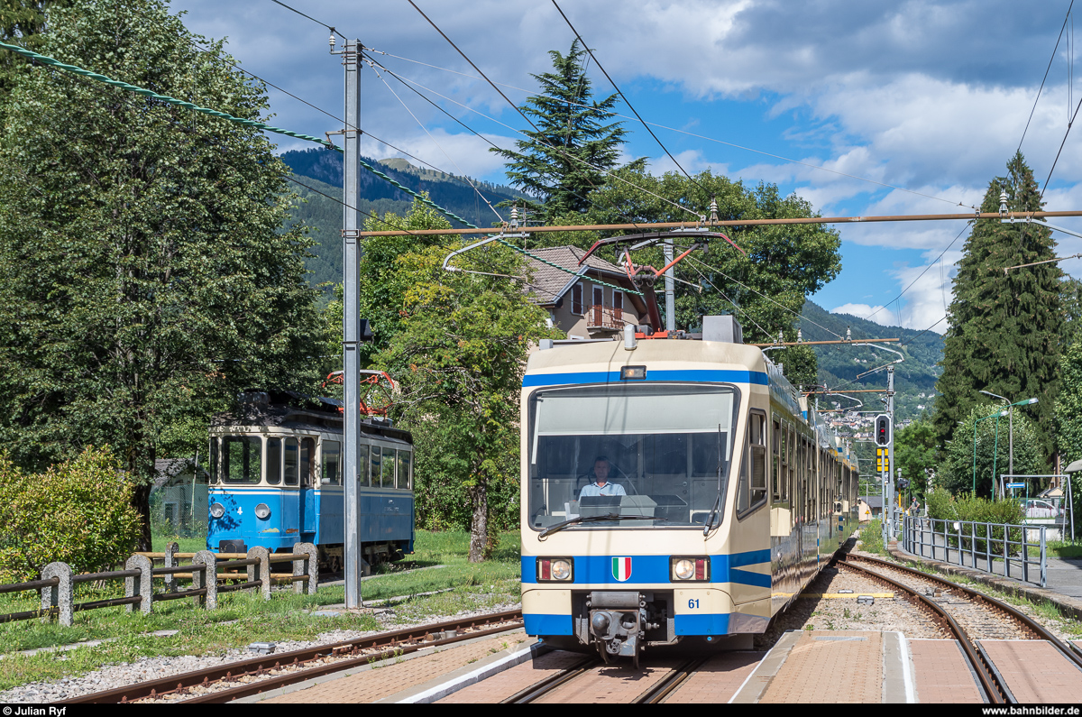 SSIF ABe 4/6 61 fährt am 25. Juli 2017 mit einem weiteren ABe 4/6 als Centovalli-Express 172 in den Bahnhof von Santa Maria Maggiore ein. Links der als Denkmal aufgestellte Xe 2/4 4.