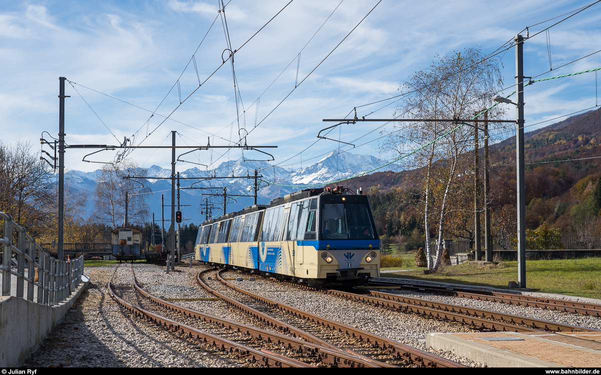 Eine Reise durchs Valle Vigezzo - Der SSIF Ferrovioa Vigezzina Treno Panoramico D47P von Domodossola nach Locarno hat noch wenige Meter Steigung vor sich, um in Santa Maria Maggiore den höchsten Punkt mit 831 müM auf seiner Fahrt zu erreichen. Interessanterweise heißen die nach Westen und Osten durch das Valle Vigezzo fließenden Flüsse (fast) gleich: Melezzo Occidentale und Melezzo Orientale und beide fließen in den Lago Maggiore. 7. Okt. 2016