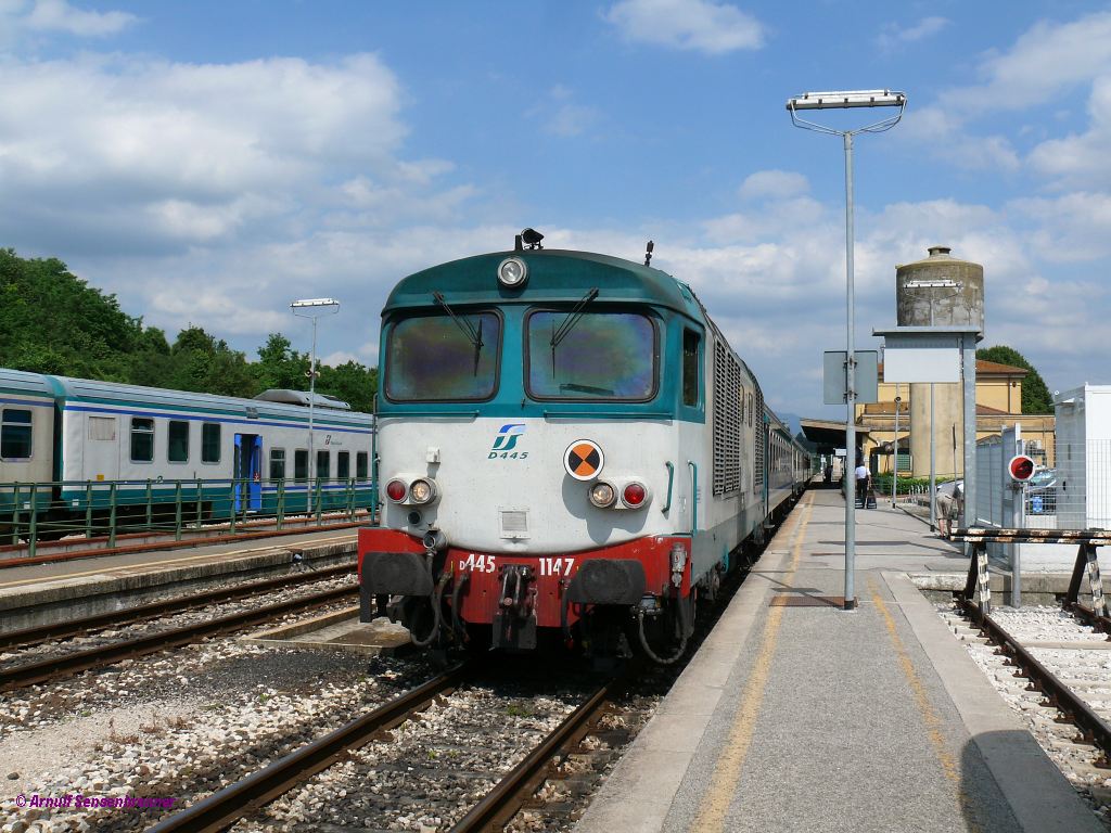 Die FS D445 1147 mit dem Zug R23593 von Firenze-S.M.N. über Pontassieve nach Borgo-San Lorenzo (an 16:08). Borgo San Lorenzo 2012-06-07