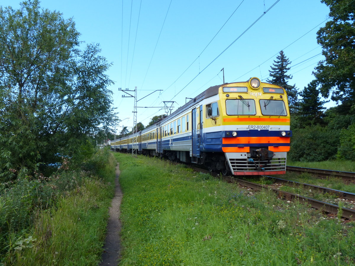 Gut genutzt werden die Züge in den Badeort Jūrmala. Einige der hier verkehrenden Züge fahren bis Sloka oder weiter nach Ķemeri, wo es einen Nationalpark zu besichtigen gibt. ER2-3034-01 am 9.8.2016 nahe Dubulti.