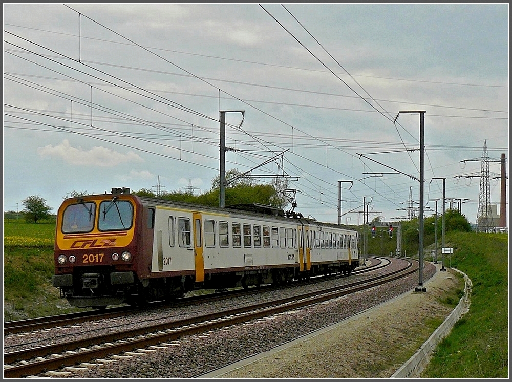 Die Strecke Luxembourg-Pétange via Dippach wird zur Zeit zweigleisig ausgebaut. Unser erstes Bild von dieser Strecke zeigt den Triebzug Z 2017 auf dem bereits fertiggestellten Teilstück zwischen Bascharage und Schouweiler. 01.05.10 (Hans) De Rond Hans und Jeanny