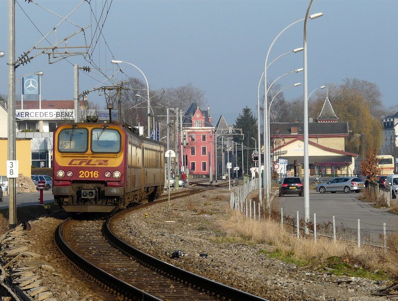 Treibzug 2016 hat den Bahnhof von Diekirch soeben in Richtung Ettelbrück verlassen. Rechts im Hintergrund ist das Bahnhofsgebäude noch zu sehen. 24.02.08