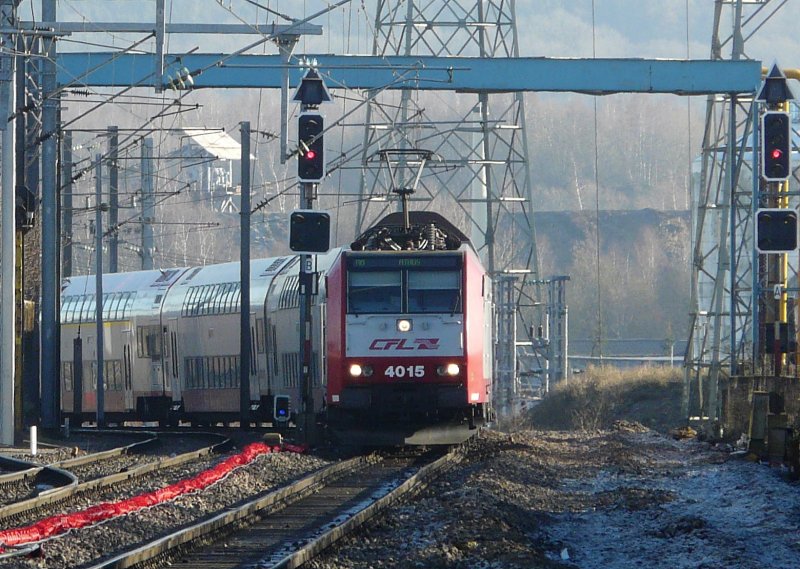 Lok 4015 nähert sich der Haltestelle Belval Usines/Rockhal aus Richtung Esch-sur-Alzette kommend. Der Personenverkehr läuft hier an der Haltestelle im Moment eingleisig. Wie man rechts im Bild sieht wird das zweite Gleis zur Zeit ersetzt. 20.12.07 De Rond Hans und Jeanny